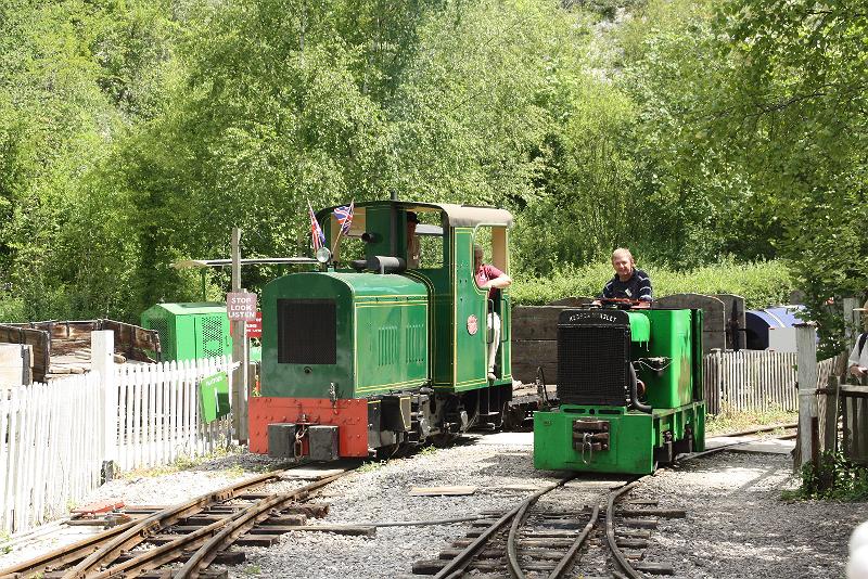 Peldon returned to service at the weekend - her she enters Brockham with a train of ammunition wagons. Hudson Hunslet 3097 - the one with the MacLaren engine - waits to draw off the wagons and release Peldon for its next train.