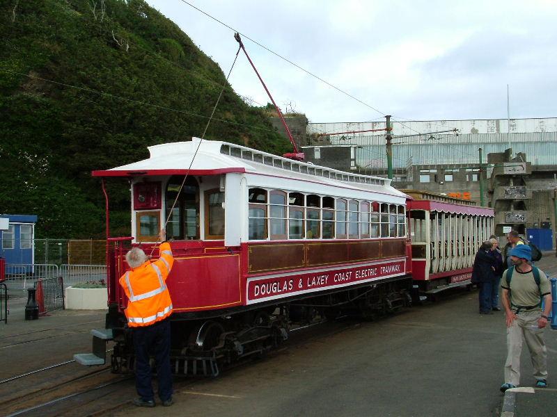 Back at Douglas, car 1 is made ready for the shunt into the car sheds.
