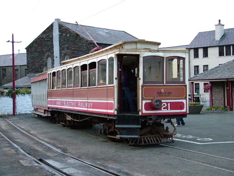 | While we were over on the Island an evening special trip was organised for entusiasts which was so well patronised that two trams had to run. This meant that with two at Ramsey at the same time the rarely used siding there had to be used. 21 has run round its trailer and shunted into said siding ................ | |