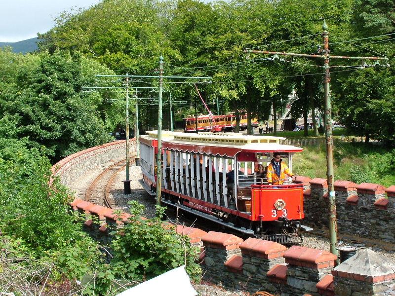 On the Douglas side of Laxey, the line crosses a curved and castilated viaduct. Toastrack car 33 heads for Douglas with a couple of Snaefell cars in the background.