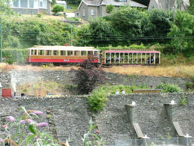 The line from Ramsey is across the valley with the Laxey Mines Railway on the shelf just below.