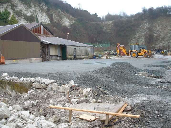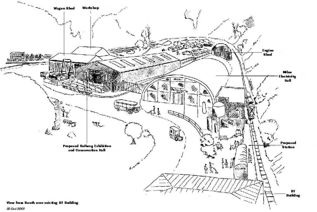 The Heritage Lottery Fund has agreed to pay up to £108,000 towards the estimated cost of a substantial building to house most of Amberley's narrow gauge collection. The "exhibition and conservation hall" will be to the rear of the existing exhibition building (the "wagon shed"), and will be linked to it. The main frontage will be to the important "square" which will exist between the electricity hall, the new BT building and, eventually, the new railway station (see sketch) . It will be steel framed and clad, and will provide about 450 square metres of display space, increasing the railway exhibition space approximately three and a half times. Planning consent has now been sought, and it is hoped that construction will take place during the winter period when the Museum is closed to the public. The clearance of the site has already begun. This will enable practically all the locomotives and wagons which are at present stored in the open or in the old tunnel to be brought under cover and properly shown to visitors. Some "clean" restoration work (carpentry and painting) to wagons and carriages will be carried out in front of the public, as well as maintenance work to operational carriages (for which the building will provide some much needed winter covered storage). Thought is being given to the way the collection will be distributed between the existing buildings (including the Betchworth Hall) and the new one. The proposed building will complement the engine running shed now being built by Museum volunteers behind the electricity hall. Maintenance and preparation of locomotives in frequent use will take place in the engine shed, with the original workshop then truly available for more major jobs: the public will not have access to these two buildings unless accompanied. The 2' gauge rail system will be continued around the northern end of the pit, inside the loop formed by the newly extended main line, to give access into both the engine shed and the new exhibition building, where there will be three tracks set in the Floor. There will also be a track within the roadway between the new building and the electricity hall, so that selected vehicles can be displayed at the front. The lottery grant is intended to be 75% of the total cost of the building. Norman Wild, the Museum's Development and Fundraising Manager (who was largely responsible for the successful bid) is hopeful of finding the balance, but part of this is in fact the value of work which will be done by Museum volunteers. Museum Chairman Graham Toole-Mackson welcomed the news of the grant. "This project has been among the main development priorities at Amberley for some time, and it is wonderful to see it approaching fruition. Putting together a bid for something like this involves a vast amount of patient work, and we are all grateful to Norman and the others who have contributed". Preparations for the new building began in November 2002 as soon as the Museum closed to the public for the winter. The size of the area to be taken up by the building is readily apparent in this photograph taken at the beginning of December.