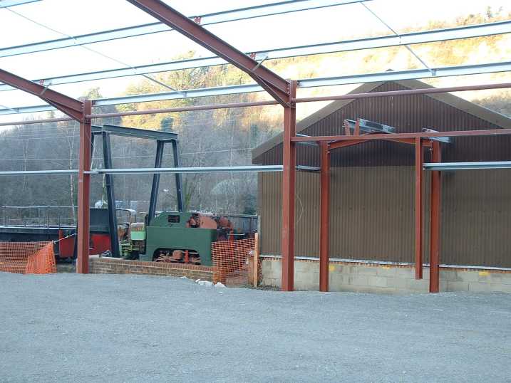 On the north side the position of the access door to be cut into the back of the existing exhibition can be seen. The William Spence Guinness brewery loco and adaptor wagon under the hoist frame can be seen in the background.