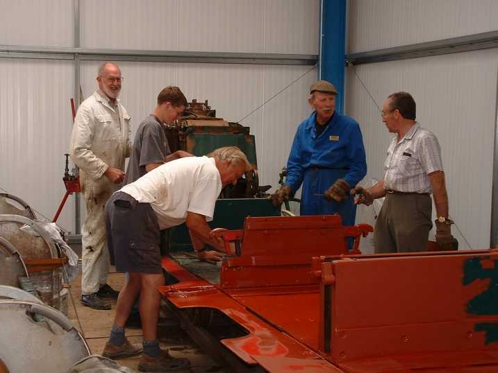 The first exhibit to be brought into the building was the Post Office Train. As it was raining on Sunday (1 June) a group of volunteers attacked it with wire brushes and red oxide paint to spruce it up a bit. The mail trolleys (left) were given a good clean too. Track panels for several other exhibits are visible beneath the mail trolleys.
