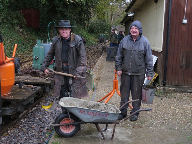 Trending!! The varied fashion statements by members of the RailGroup are illustrated here by Andy and Steve (in the hat) as they mix cement for the block laying.