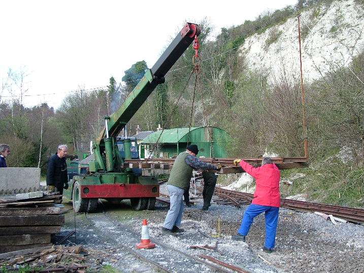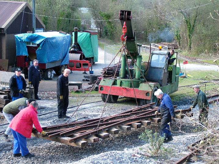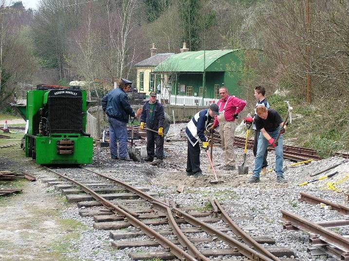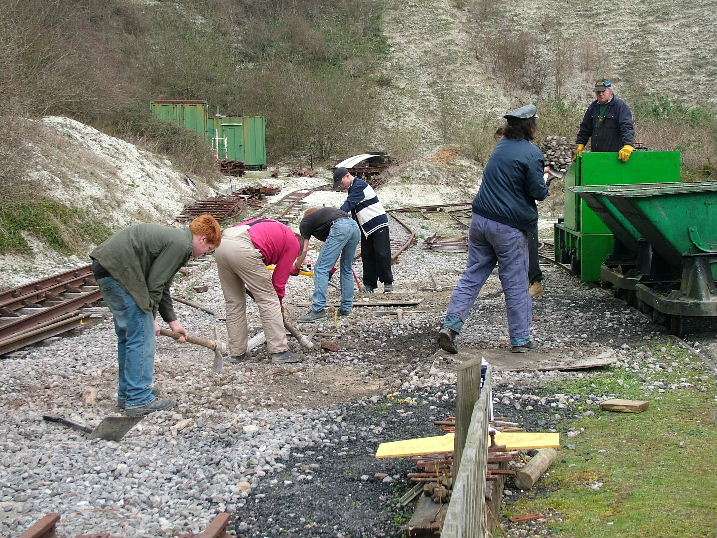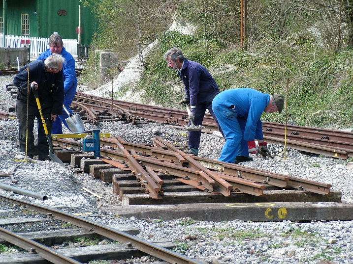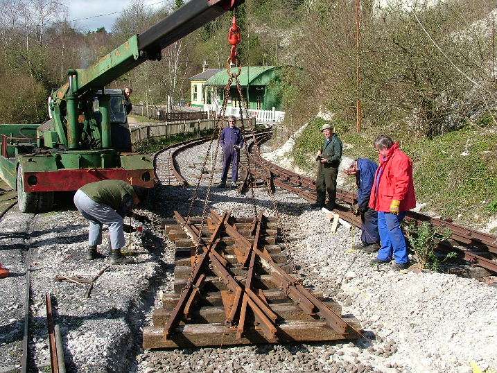 Railway volunteers dig out the old ballast ready for the diamond to be lifted into place.