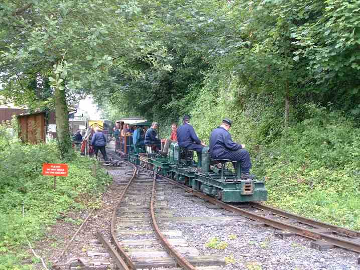 Graham Feldwick, who was instrumental in the organisation of the event, aboard his petrol engined Lister Railtruck, followed by his diesel engined example, heading a train of small