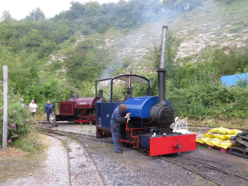 Wendy gets steam up on Sunday morning. The long chimney extension is to improve drafting and speed up steam raising. Peter, one of the Museum residents, stands in the background