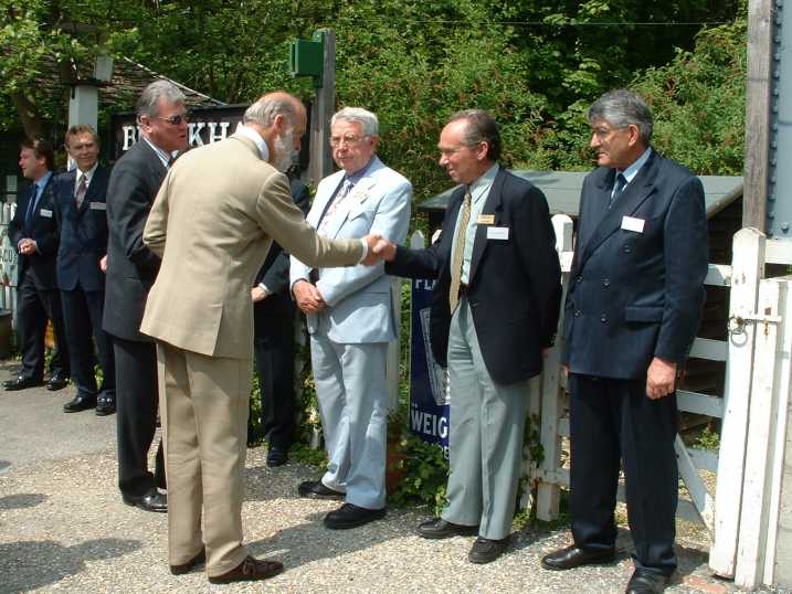 On alighting from the train, Graham Toole-Mackson, the Museum's Chairman of Trustees, introduced the Prince to the railway volunteers responsible for the planning and execution of the project. Left to right, they are John Crosby, John Beard and Dick Foster.