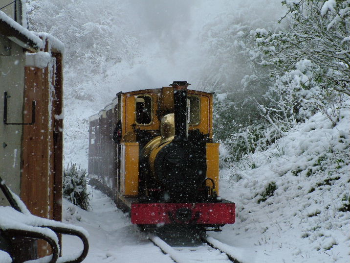 Passing behind the loco shed it's all downhill. The amount of snow on the railhead is evident here.