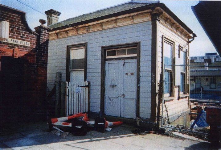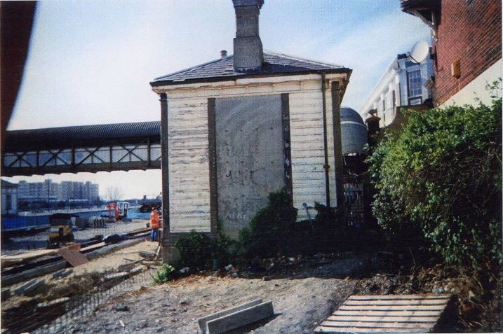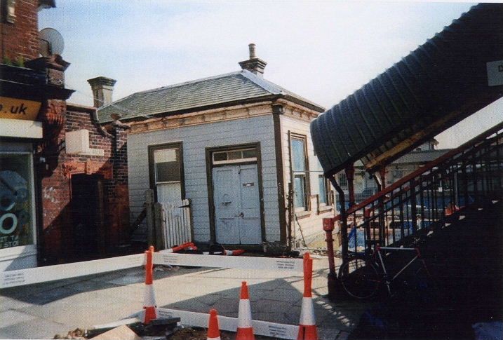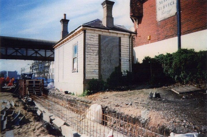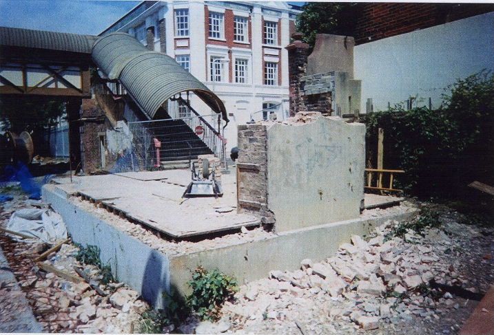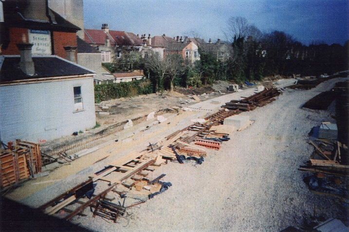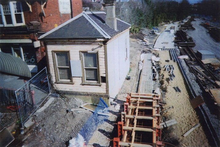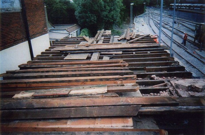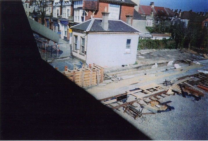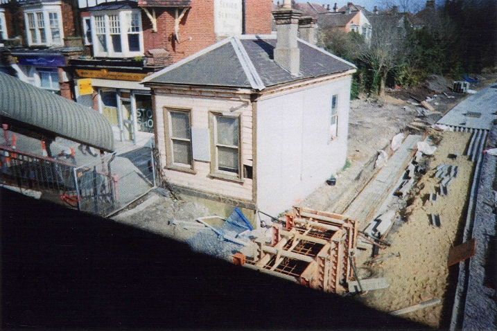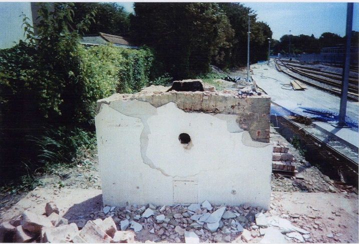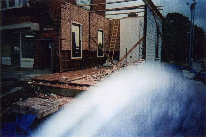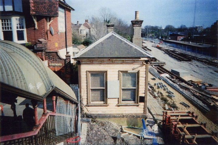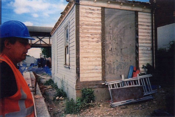 The building was dismantled in a rather alarming fashion using among other things, a chain saw. Note that as the building came down the works going on the background the laying of the new sidings in the former station goods yard.