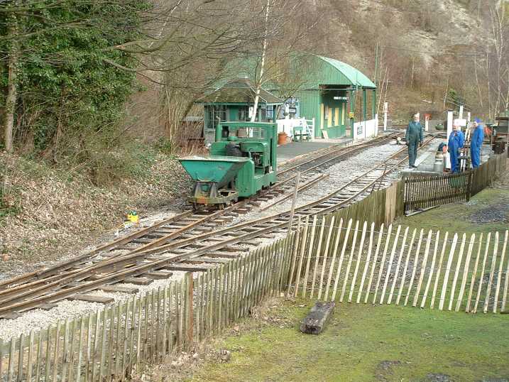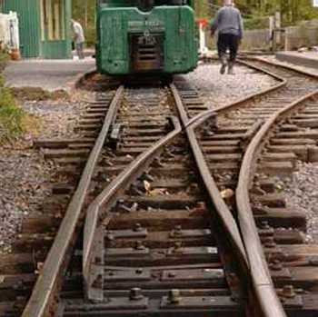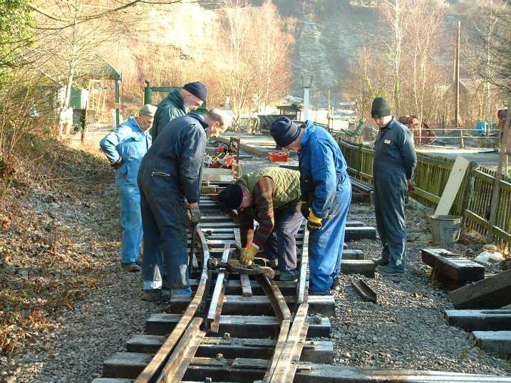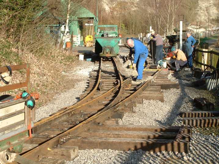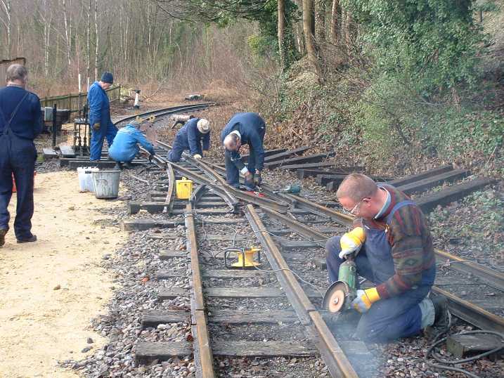 The following pictures show just one example of a major engineering project tackled by the RailGroup at the Museum over the winter period - in this case, 2003/4. The job was to extend the length of the run-round loop at Brockham which involved moving the points from their present position to a new location on the bend approaching the station. This involved not only dismantling the points but also reforming the geometry to suit the new layout. It was transformed from a conventional right-hand turnout to a curved left hand. Here is how we did it.